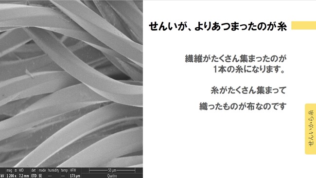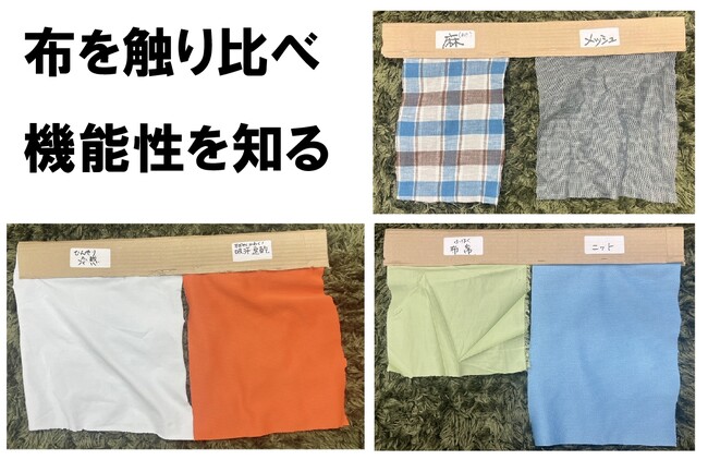 まず、児童たちは繊維がどのように糸になり、そして糸が布になるのかを実際に使っている糸と布を触って、見て、学びました。さらに、布には吸汗速乾性や冷感、UVカットなどの機能性があることを知り、それらの特徴についても実際に6種類の素材を触り比べてクラスメイトと話し合い、勉強しました。