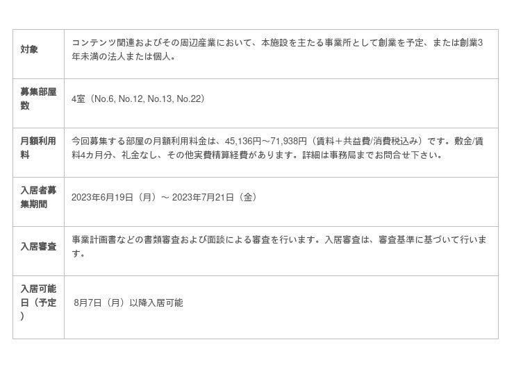 アニメ、映画、ゲーム、web3.0、NFT、VRなどコンテンツ分野の起業家の皆さんに、格安の家賃で完全個室タイプのレンタルオフィスを提供し、コンテンツビジネスのスペシャリストである常駐スタッフがワンストップの経営支援を行います。