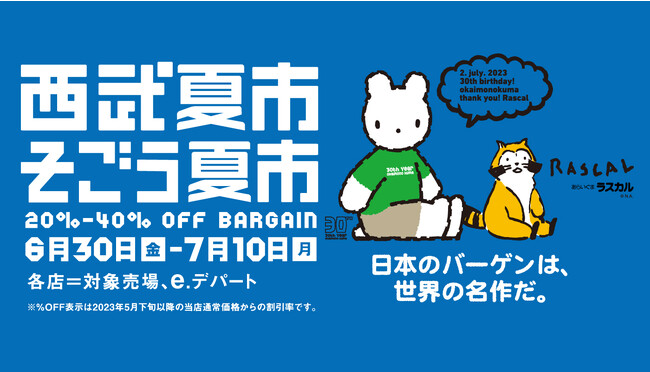 今年は昨年に比べて外出機運が高まり、行動制限のない本格的な夏シーズンが到来。そごう・西武では、夏本番に活躍するアイテムをお得にご購入いただける、クリアランスセール「西武夏市/そごう夏市」を6月30日(金)から開催いたします。本年7月2日(日)は長年そごう・西武の夏と冬のバーゲンキャラクターを務めてきた「おかいものクマ」の30歳の誕生日。誕生から30年を記念した「おかいものクマ」コラボオリジナル商品のプレゼントや限定販売で夏市を盛り上げます。