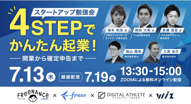 7月13日(木)、7月19日(水)※、株式会社Wiz(本社:東京都豊島区、代表取締役社長:山崎 俊)は、GMOクリエイターズネットワーク株式会社(以下、GMOクリエイターズネットワーク)、freee株式会社(以下、freee)、デジタルアスリート株式会社(以下、デジタルアスリート)の3社と、起業を志す皆さまに向けた勉強会を開催いたします。