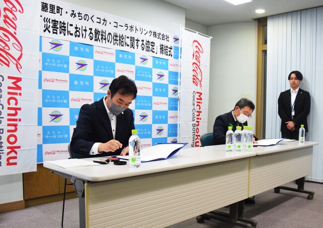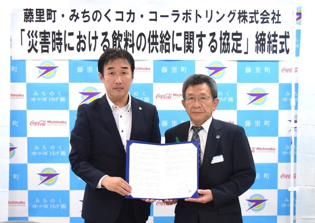 このたび、みちのくコカ・コーラボトリング株式会社(本社: 岩手県盛岡市、代表取締役社長: 谷村 広和)は、秋田県山本郡藤里町(町長: 佐々木 文明)との間で、「災害時における飲料の確保に関する協定」を締結することとし、6月22日(木)に締結式を開催いたしました。