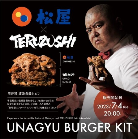 2023年の夏の土用の丑の日である7月30日(日)に向けて、照寿司とコラボレーションした「UNAGYU BURGER KIT」を7月4日(火)の20:00から楽天市場で販売開始いたします。照寿司は、伝統にとらわれない奇抜なパフォーマンスや圧巻の料理で世界中から北九州市にお客様が集まる、高級寿司屋。この度コラボレーションした「UNAGYU BURGER KIT」は、松屋の王道定番の牛めしと、照寿司監修の「うなぎの蒲焼き」、「九州有明産特上海苔」がセットになった特別な商品で、鰻の香ばしさとサクッとした食感で風味豊かな海苔が口の中に広がり、後から感じる牛めし肉の旨味とタレの甘味がたまらない味わいに仕上がっています。この機会にぜひ、ご堪能ください。