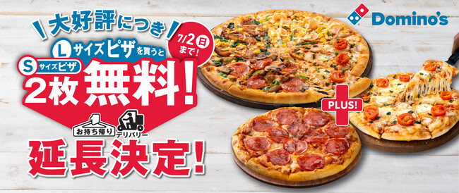 株式会社ドミノ・ピザ ジャパン(代表取締役:ジョシュア・キリムニック、CEO:マーティン・スティーンクス、本社:東京都品川区、以下:ドミノ・ピザ)が展開する国内No.1シェアを誇る宅配ピザチェーン ドミノ・ピザは、6月19日(月)から25日(日)までの予定で実施中の「Lサイズピザを買うとSサイズピザ2枚無料!」キャンペーンを、大好評につき、7月2日(日)まで延長いたします。