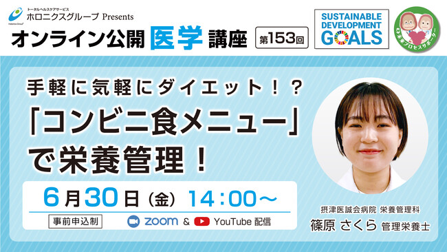 医療法人医誠会(大阪府大阪市 代表者: 谷幸治)では、第153回オンライン公開医学講座 『「コンビニ食メニュー」で栄養管理』を2023年6月30日(金)にオンラインで配信いたします。