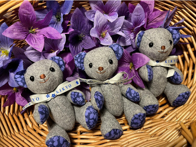 生産を依頼したテディベアの工房「軽井沢ベアーズ」(長野県北佐久郡軽井沢町)は、アニバーサリーベアやお形見ベアなどすべてがハンドメイドの作品です。今回のKIKYOベアは、桔梗の花を連想する青紫色を耳と手足にあしらったチャーム付きのやわらかな風合いのグレーの生地が特徴です。チャーム付きで全長は約13cmのためカバンに付けて持ち歩くこともできます。5周年記念宿泊プランでしか手に入らないKIKYOベアとともに軽井沢の地でゆっくりと流れる時間をお過ごしいただけます。