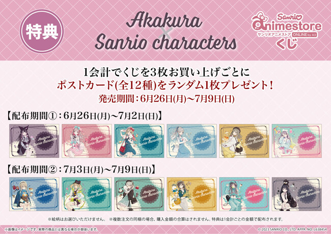 「赤倉×サンリオキャラクターズ」のくじを1会計3枚お買い上げごとに、特典ポストカード(全12種)をランダムで1枚プレゼント。期間によってポストカードの種類が変わります!
