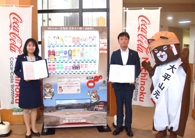 また、この協定に基づき、「北海道・北東北の縄文遺跡群」PR自動販売機(以下「縄文PR自販機)を、外ヶ浜町役場1階 エントランスに設置いたしました。縄文PR自販機は、外ヶ浜町では初めての設置となり、「大平山元遺跡」と、同遺跡もりあげたいキャラクター「むーもん」をデザインしたラッピングを施し、市民や遺跡来訪者に対する機運醸成を広く図ります。なお、縄文遺跡群は、北海道に6つ、青森県に8つ、岩手県に1つ、秋田県に2つあり、北東北を事業エリアとする当社は、縄文PR自販機にその地域ならではのデザインをあしらいながら設置を増やすことで、観光客の回遊を促し地域経済への貢献を狙います。