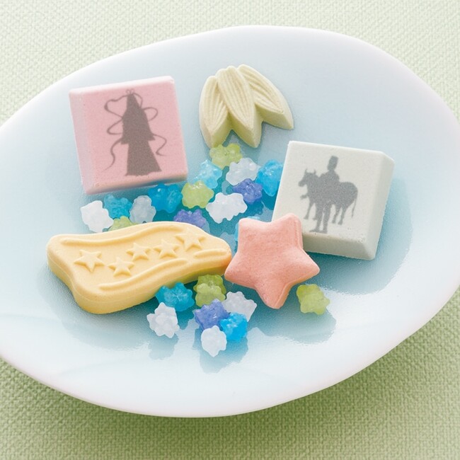 香川県の特産品であるさぬき和三宝糖を、昔ながらの伝統的な手法で製造。彦星様・織り姫様の七夕の和三盆と、夜空に流れる天の川をイメージした金平糖などの詰合せ。