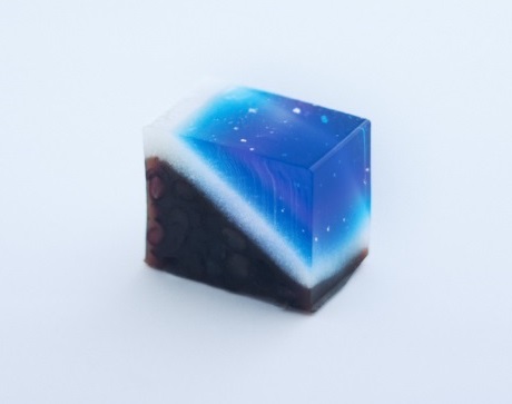 京菓子の伝統を壊す事なく真心の籠った菓子作りに精進する七條甘春堂。夜空に溢れる銀河「天の川。深い青の琥珀羹に銀箔を散りばめ七夕の世界を映しました。