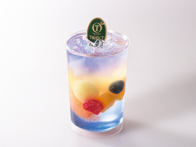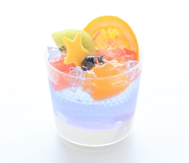 バタフライピージュレにシークァーサージュレを重ね、フルーツを浮かべたジュレデザート。