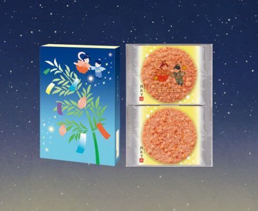 織姫と彦星のかわいい絵柄のパッケージ入り。赤えびの旨みをぎゅっと凝縮したえびせんべいです。