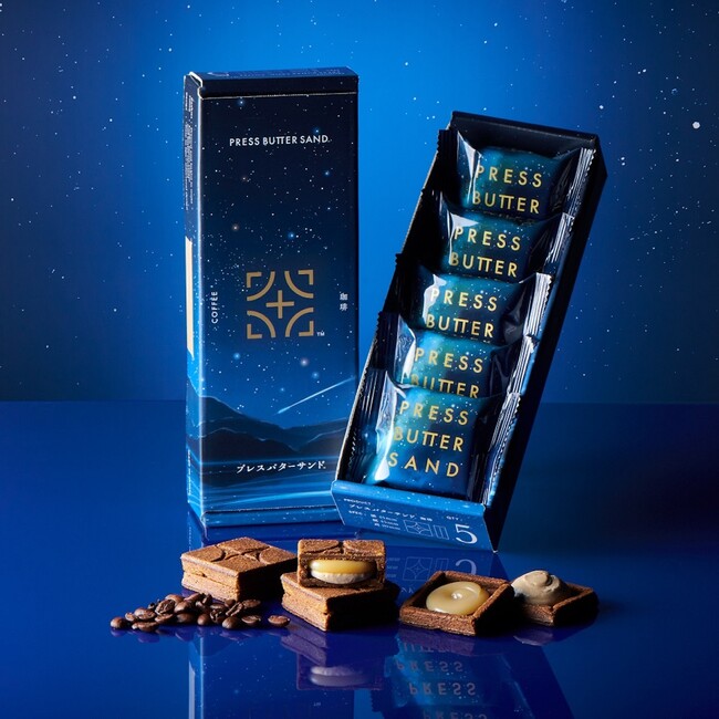 香り高いコーヒークッキーにコーヒーバタークリームと、優しい甘さのバターキャラメルを合わせました。「夜空」をモチーフとした限定パッケージ入り。