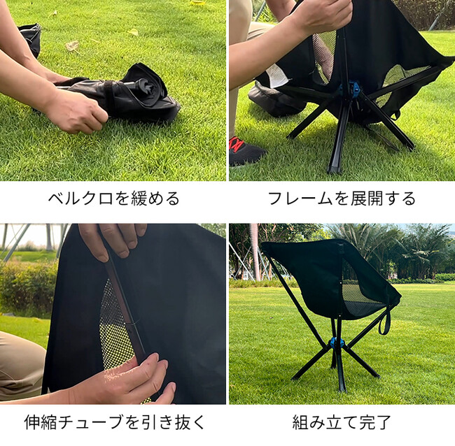 数秒で組み立て&収納できるので初心者に最適!ゆとりのあるサイズで快適に座りやすいデザインです。夏でも涼しいメッシュ生地を採用し、キャンプや登山、バーベキューなどあらゆるアウトドアシーンで活躍します。
