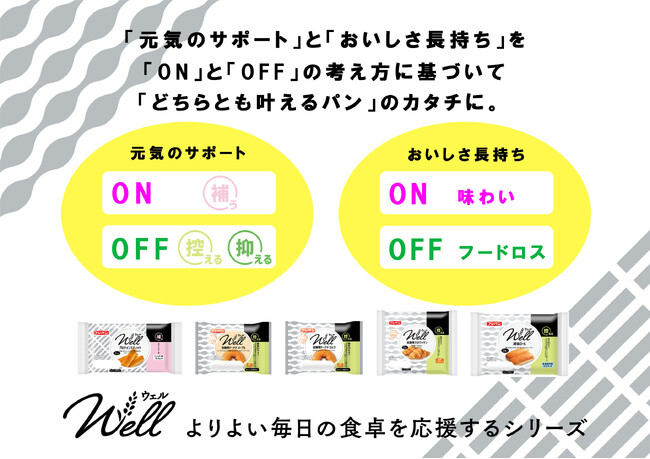 昨今のパン市場において「ウェルネスパン」は機能・おいしさの認知により、更なる市場拡大が見込まれております。一方ロングライフパンも食品ロス軽減の観点などによる意識の高まりから市場拡大が見込まれます。「Well(ウェル)」シリーズでは、たんぱく質の摂取、糖質オフ、塩分オフなど「ON(補う)」と「OFF(控える)」の考え方で「ウェルネス要素(元気のサポート)」と「おいしさ長持ち」のどちらの要素も両立するロングライフパンシリーズとして誕生しました。