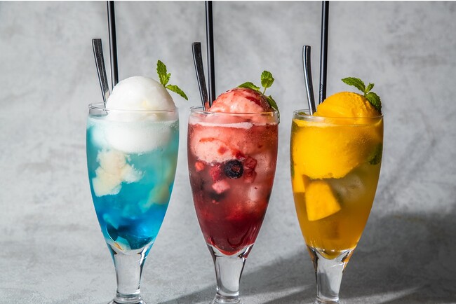 カクテルは「ソルト&ライチ」「ストロベリー」「マンゴーモヒート」の3種のフレーバーをご用意。お酒が苦手な方でも楽しめるよう、フルーツやシャーベットをたっぷり使用し、パフェのような感覚で味わうスイーツカクテルに仕上げました。