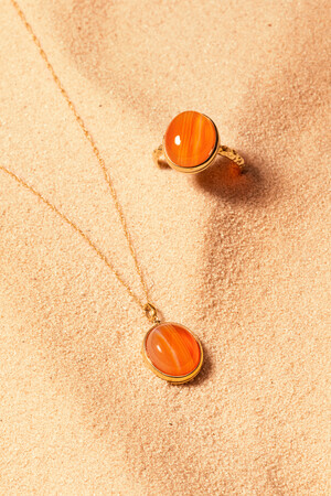 地金に施した槌目風の、大地のパワーを感じる力強いテクスチャーとは裏腹に、艶のあるオレンジアゲートの優しい丸みは、相反する魅力が際立つ。