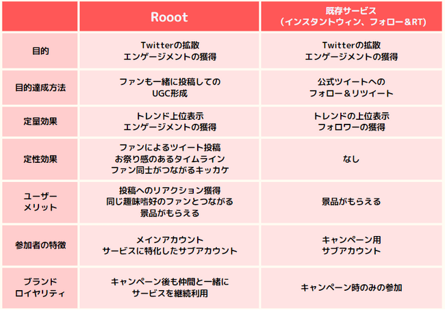 Roootは、ファンと共にキャンペーンを盛り上げるファンマーケティングサービスであり、従来のTwitterキャンペーンサービスとは次の点で異なります。