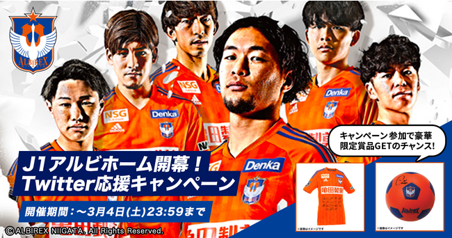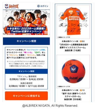 キャンペーンでは、Twitter上で「#J1アルビホーム開幕」というハッシュタグが付いたツイートに対して「いいね」や「リツイート」をするとポイントがもらえます。