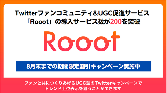 株式会社ドリコム(本社:東京都品川区、代表取締役社長 内藤裕紀)と株式会社MOTTO(本社:東京都練馬区、代表取締役 佐藤 基)はTwitterを活用したファンコミュニティ&UGC促進サービス「Rooot」(ルート)の導入サービス数が200を突破したことをお知らせいたします。これを記念して、Roootをはじめてご利用のサービスに対して8月末までの期間限定割引キャンペーンを実施します。