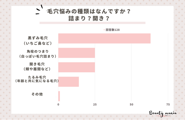「毛穴悩みの種類はなんですか?詰まり?開き?」とアンケート調査した結果、1位は『黒ずみ毛穴(いちご鼻など)(63人)』、2位は『角栓のつまり(白っぽい毛穴詰まり)(25人)』、3位は『開き毛穴(頬や眉間など)(25人)』となっています。