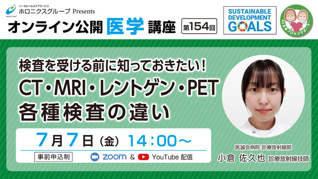 医療法人医誠会(大阪府大阪市 代表者: 谷幸治)では、第154回オンライン公開医学講座 『CT・MRI・レントゲン・PET各種検査の違い』を2023年7月7日(金)にオンラインで配信いたします。