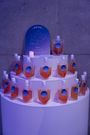 ほっとリラックスできるような「YOLUオリジナルドリンク」として、ペアーとローズヒップをブレンドした「ハーブティーレモネード」のパウチドリンクを提供しました。ペアーの風味とローズヒップが絶妙に調和し、心地よい酸味と甘みを楽しめる、心身をリフレッシュさせる一杯です。ペアーはリラックスナイトリペアシリーズ(シャンプー、トリートメント、ヘアマスク)の香りにも使われており、ドリンクのカラーは、YOLUのパッケージのグラデーションをイメージしています。