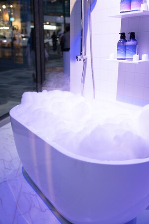 入り口すぐのウェルカムスペースには、夜のリラックスタイム、夜間美容タイムの始まりを表現したバスルームでお出迎え。バスタブの蒸気からは「YOLUカームナイト」のアロマの香りを体験いただきました。