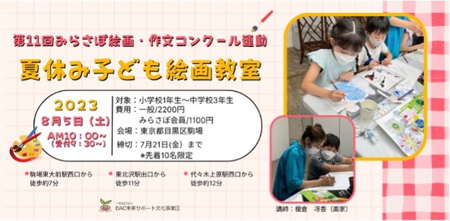 株式会社 DAC ホールディングス(本社:東京都台東区、代表:石川和則・前山敏行)が社会貢献活動の一環として運営する一般社団法人DAC未来サポート文化事業団(代表理事:石川和則、以下みらさぽ)は、文科省後援の「第11回みらさぽ絵画・作文コンクール」の連動企画として、東京都駒場にて「夏休み子ども絵画教室」を実施いたします。