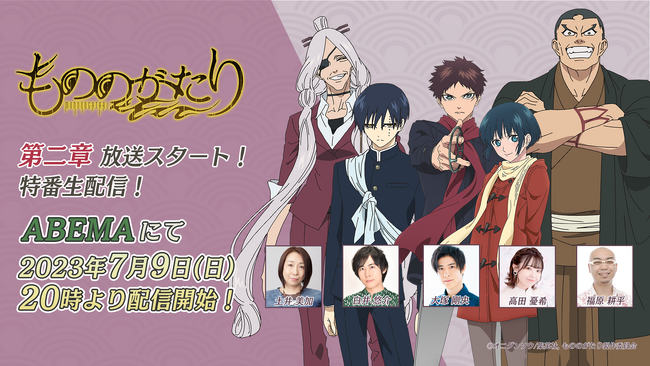 7月3日(月)24時より開幕となるTVアニメ『もののがたり』第⼆章の放送を記念して、ABEMAでの生配信特番の実施が決定致しました! 第二章から初登場となる、京都三大付喪神の一角にして人間に音楽を聞かせたいという本懐を持つ「雅楽寮」のキャスト3名をお迎えしてお届けします。特番生配信では初タッグを組むメンバーでのスペシャルトークを是非、ご覧下さい!