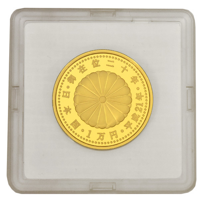 今上陛下の即位20周年を記念し同年11月に造幣局より発行された記念金貨です。図柄は表面が「鳳凰と瑞雲と皇居・二重橋」、裏面には皇室の御紋章「菊花紋章」がデザインされています。