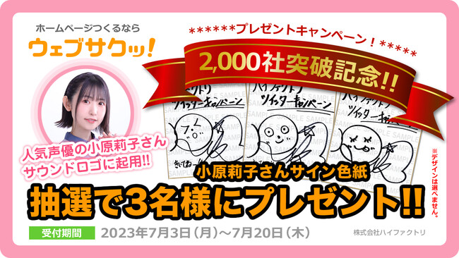株式会社ハイファクトリ(東京都渋谷区、代表取締役: 岩瀬浩延)は、CMS SaaSサービス「ウェブサクッ!」の導入2,000社達成記念に、サービスの公式動画を公開しました。動画の冒頭のサウンドロゴには、Twitterフォロワー数15万超えの人気声優である「小原莉子」さんを起用し、動画公開キャンペーンとして、サイン色紙を抽選で3名様にプレゼントします。