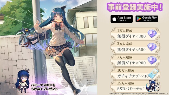 事前登録者数1万人達成時には「無償ダイヤ」を300個、10万人達成時には「ガチャチケット」を10枚、15万人達成時には「SSR パミーナ」をお客様全員にプレゼント!
