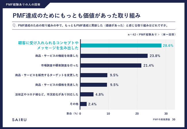 なかでも、PMF達成のためにもっとも貢献した(価値があった)取り組みを聞いたところ、「顧客に受け入れられるメッセージを生み出した」が最多となりました。PMF達成には、顧客視点で商品・サービスを見直す行動が必要であることがわかります。