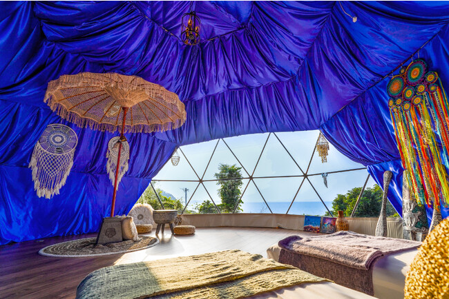 森の中の白いドームテントの広い窓に広がるのは、輝く海。海に沈む夕日が幻想的な室内は、青を基調としたギリシャのエーゲ海をコンセプトとしたデザーナーズルーム。森の中のプライベートガーデンには120本以上のハーブとブルーベリーの木を植林。爽やかな緑の香りに包また空をみあげると思わず“幸せ”を感じてしまいます。