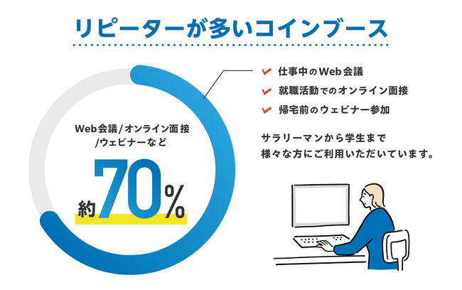 コロナ禍の影響で「オンライン会議」が定着し、オンライン会議ができる場所のニーズが急速に拡大しました。コインブース運用はそのニーズを捉え、急速に拡大を続けています。