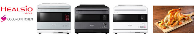 左より、ウォーターオーブン「ヘルシオ」<AX-LSX3A-S(バイブレーションシルバー)/AX-RS1A-H(グレー系ダークメタル)/AX-NS1A-W(ホワイト系)>、『黒さつま鶏』ローストチキン丸鶏(イメージ)