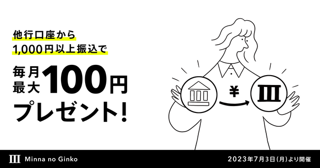 株式会社みんなの銀行(取締役頭取 永吉 健一、以下「みんなの銀行」)は、2023年7月3日から常設プログラムとして『毎月もらえる!振込入金プログラム』を実施します。
