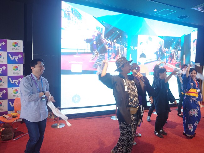本番ではアバターがリアルの盆踊り中に少しずつ溶け込み、遂には一緒にアバターが踊りだしました。本番中アバターがジャンプとタオルふりを同時にしてこられたのを見てその場でアドリブで一手を増やしました。まさにこれぞメタバース世界での化学反応。何でもできる反面、動きは限られてしまう中ですが、そのジレンマは何のその、その場一手が広がりました。これこそがメタ盆踊りの第一歩の踏み出しではないでしょうか。