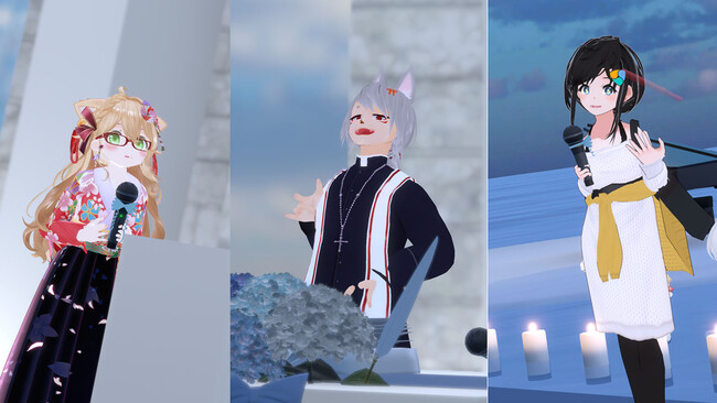 司会として進行してくれたAWA公認配信者・赤穂みのりさん(左着物姿)、牧師役を務めたクリエイター兼Vtuber・匠さん(中央聖装)、披露宴にて主賓挨拶を務めた桃宮ナツキの姉にあたるバーチャル美少女ねむさん(白いワンピースの中央に黒・黄ベルト)【撮影:もっさん】