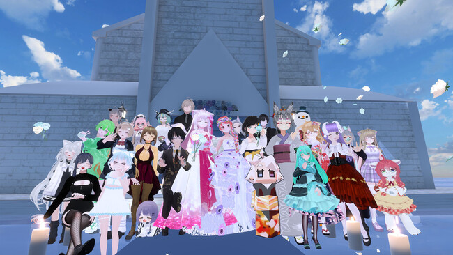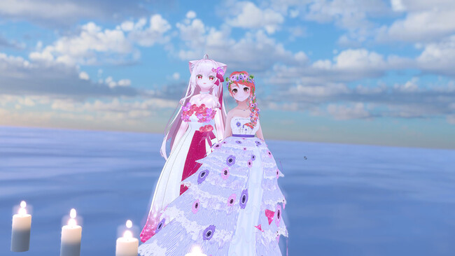 メタバースにいま最も近いと目されているVRChatで幅広いスキルや文化を学ぶ桃宮ナツキが、リアルで叶えられていない夢をVRで叶える為にスタートさせた「お砂糖式企画」がついに決行されました。「お砂糖」とはアバターや中の人の個性を問わず、友人・仲間以上に仲良くなった関係を指し、Twitterなどでは「#お砂糖報告」をつけてウェディングドレス姿や交換した指輪を披露する風習があります。「お砂糖式」とは、VR空間においての結婚式の概念に近いものです。 「お砂糖」は通常ひっそりとプライベートな場で行われることが多いものですが、今回メタバースの文化振興のために敢えてお砂糖相手の公募~お砂糖式まで可能な限りオープンなカタチで実施しました。式ではお砂糖相手・龍二さんと、二人そろって豪華で美しいドレス姿を披露してくれました。式はリアルの結婚式に則りつつ、披露宴では「メタバース進化論」の著者として知られ、桃宮ナツキの姉にあたる「バーチャル美少女ねむ」(https://twitter.com/nemchan_nel/)さんが来賓としてあいさつを行ったほか、ねむさんと桃宮ナツキの3Dモデリングのママであるクリエイターの「私」(https://twitter.com/aff09a10 )さんとバージンロードを歩くなど、VRならではの演出や交流の様子を含んだ賑やかな配信イベントとなりました。VRChatでは日々リアルにも負けず劣らずの濃密な人間ドラマが繰り広げられています。桃宮ナツキと龍二さんのお砂糖関係を温かくお見守り頂けますと幸いです。