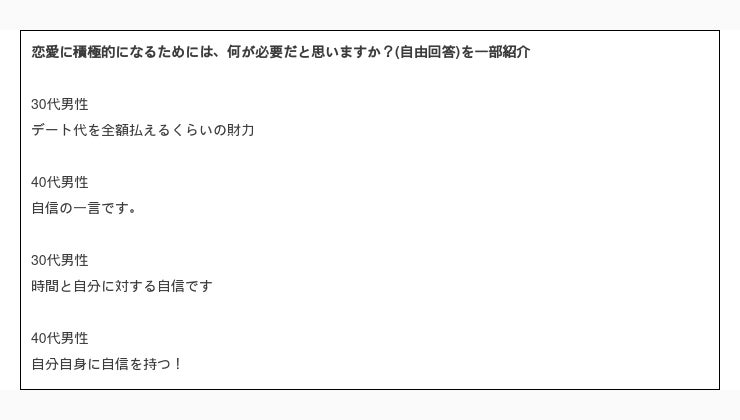 恋愛に積極的になるためには、何が必要だと思いますか?という回答を自由記述でいただいています。