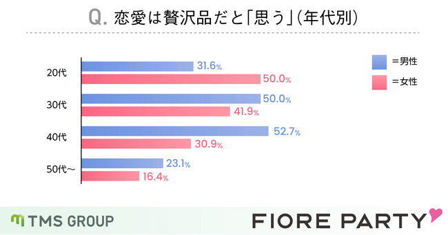 TMSグループが運営する「フィオーレパーティー(https://www.fiore-party.com/)」は、婚活中の男女を対象に、恋愛は贅沢品だと思うか?のアンケート調査を実施いたしました。