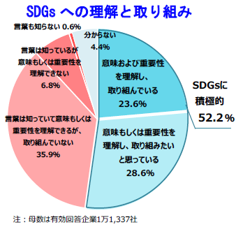 帝国データバンクが2022年6月に全国25,405社に対し行った「SDGsに関する調査」によると、SDGsに積極的な企業は、前回調査(2021年6月)より12.5ポイント増の52.2%と半数以上となり、年々その意識や取り組みが拡大していることが分かります。