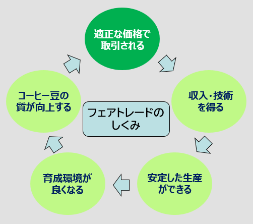 フェアトレードとは、開発途上国の原料や製品を適正な価格で継続的に購入することにより、立場の弱い開発途上国の生産者や労働者の生活改善と自立を目指す「貿易のしくみ」です。