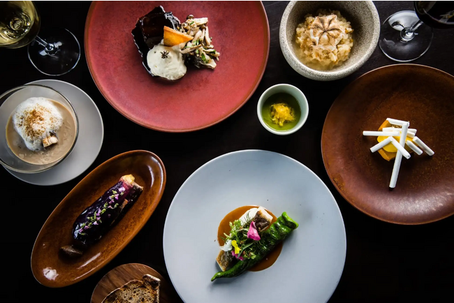 ホテル14Fレストラン「Opuses(オウパセズ)」は株式会社トランジットジェネラルオフィスがプロデュース・オペレーションを手掛ける、美意識を集約したモダンな空間でアート作品のようなメニューを提供。日本各地から取り寄せた魚介や野菜を特製窯で調理する「モダンシーフードグリル」をメインに、広尾の一つ星フランス料理レストラン「Ode(オード)」のオーナーシェフ生井 祐介氏がメニュー監修しています。