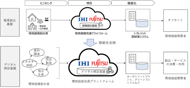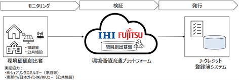 株式会社IHI(注1)(以下 IHI)と富士通株式会社(注2)(以下 富士通)は、2022年度よりカーボンニュートラルへの貢献と環境価値取引を支える「環境価値流通プラットフォーム」の実現に向けて共同事業プロジェクトを進めており、このたび、J-クレジット(注3)発行に向けた環境価値創出プロセス(CO2排出量などのデータ収集、検証、報告)を簡易化する「簡易創出基盤(注4)」の取り組みを2023年6月より開始しました。