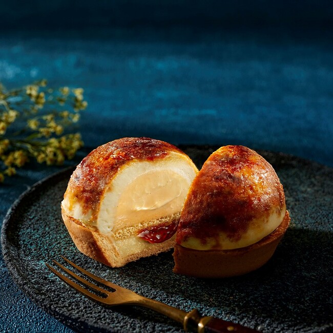 ほろ苦いカラメルソースをとろっと閉じ込めたタルトにのせて、直火でひとつひとつ丁寧にブリュレしました。