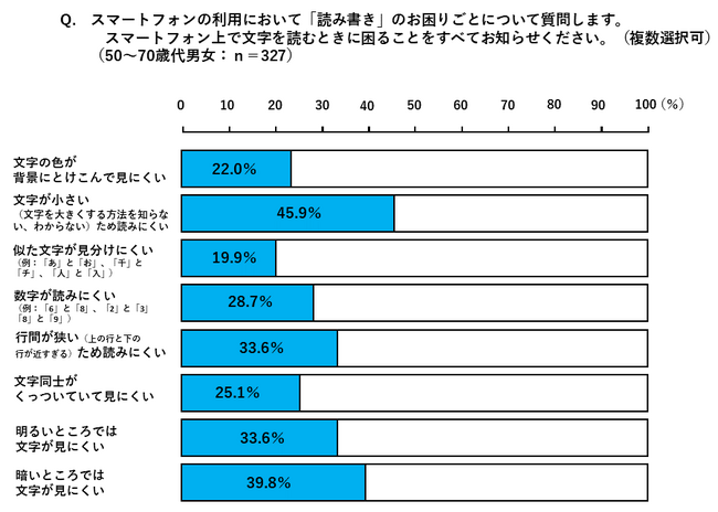 株式会社日本SPセンター(本社:東京都渋谷区/社長:渡邉一男)の シニアマーケティング研究室は2023年1月に50~70歳代のスマートフォンユーザーに向けて「スマートフォンでの読み書き」について調査を行った。そのなかでスマートフォンでの読み書きで、最も困っていることに対する回答では「読む」に対しては「小さな文字」が半数近く(45.9%)を占めた。いっぽう「書く」では「文字種の切り替えが面倒、わかりにくい」(40.1%)であった。