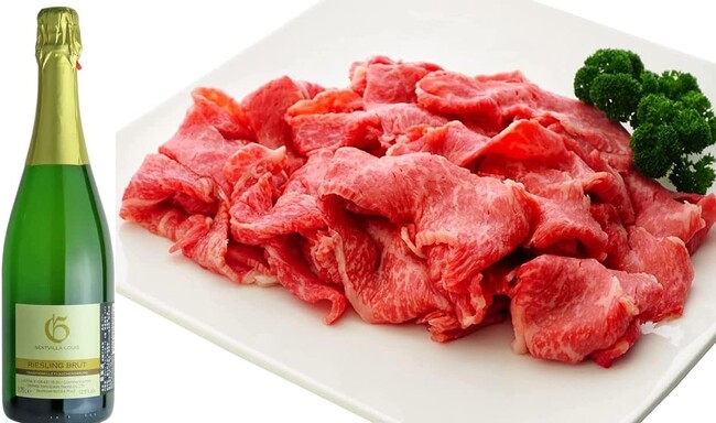 黒毛和牛切落し500gと、長期熟成による繊細な泡が特長のリースリング ゼクト750mlを組み合わせました