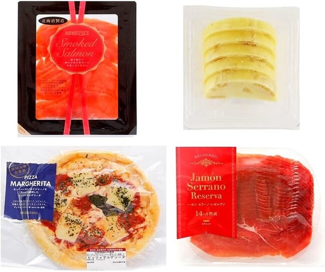 成城石井オリジナルの「スモークサーモンスライス 110g」「かずのこチーズ 1pk」「モッツアレラとパルミジャーノのピッツアマルゲリータ1枚」「ハモンセラーノレゼルヴァ14ヶ月熟成 200g」のセットです。